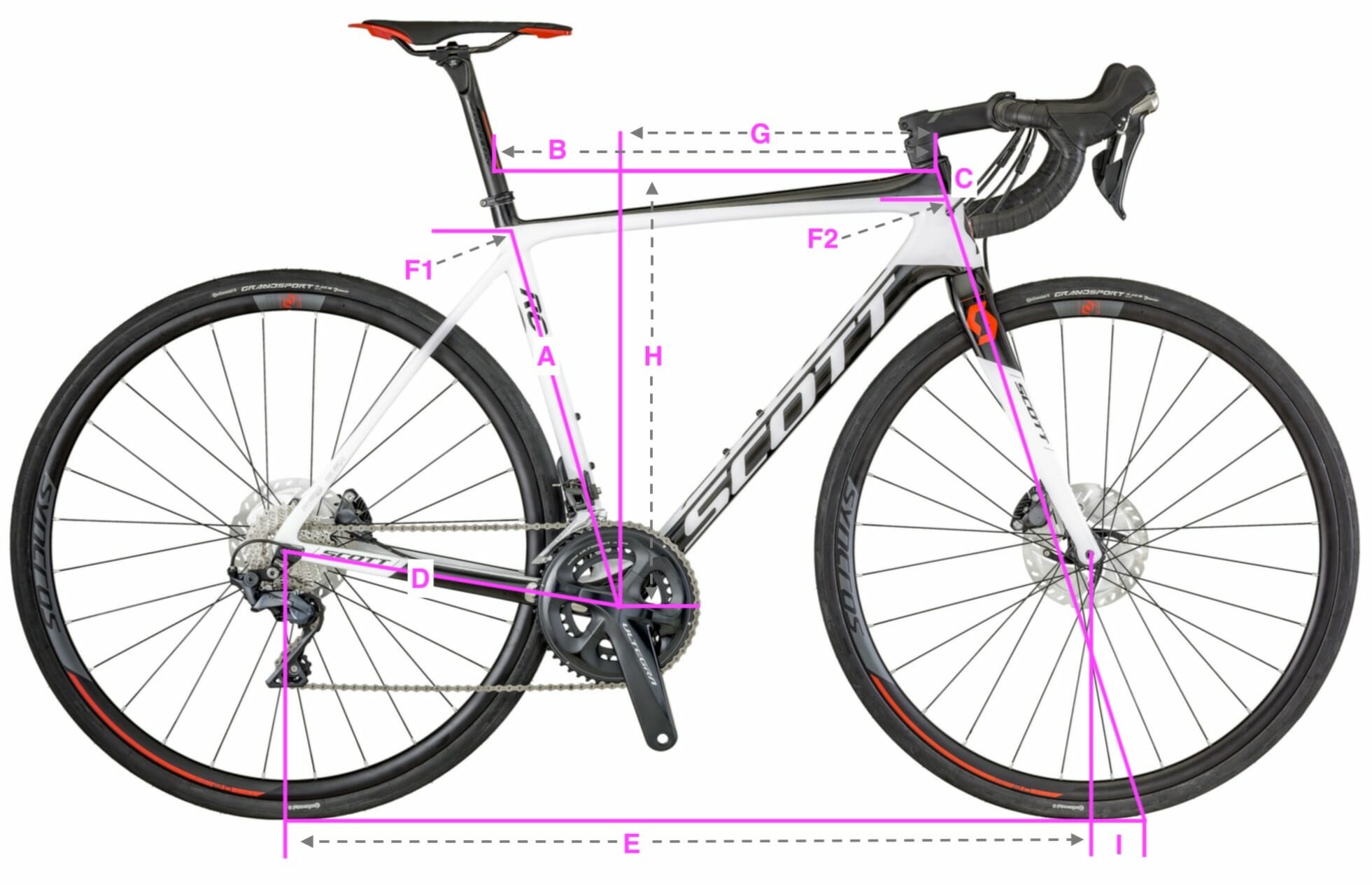 Når man snakker om størrelsen på en racer ramme, snakker man gjerne om en 54 cm eller en 56 cm. Det målet refererer til lengden på seterøret (A). Undertegnede er 180 på sokkelesten og sitter noen ganger godt på 54 cm og andre ganger på en 56 cm. Det er kommer an på geometrien.